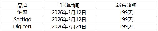 证书续期:根据各品牌生效日起,所有续期的SSL证书最长有效期不超过199天。
