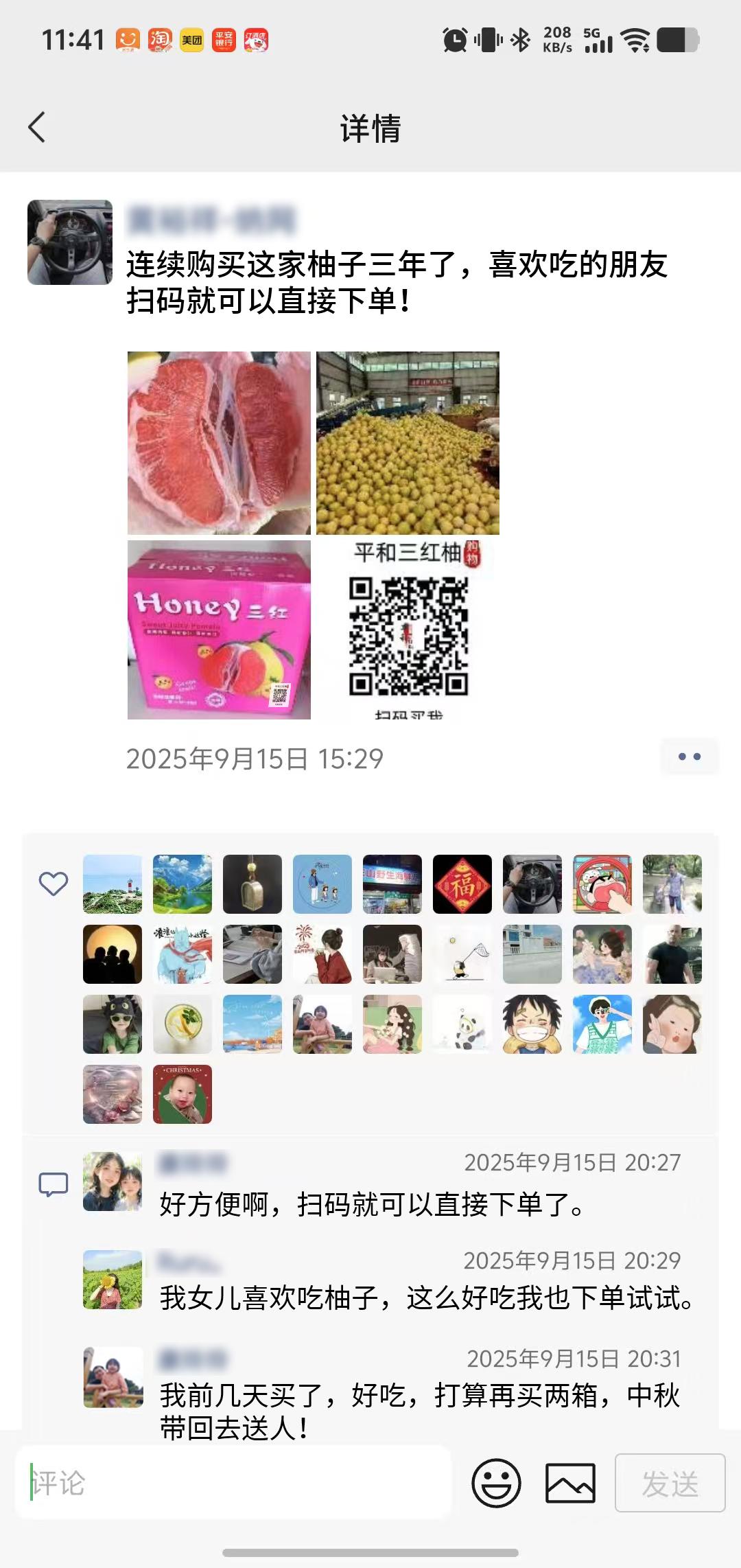 随着“叮”的一声轻响,手机屏幕亮起,瞬间跳转到了那个熟悉的 “平和三红柚.购物”购买页面。“瞧,今年的蜜柚个头更饱满了!”李阿姨一边滑动页面看着柚子介绍,一边笑着对老伴说,“扫这个码,就能直接下单购买了,地址都不用重新输,跟回家一样方便。”
